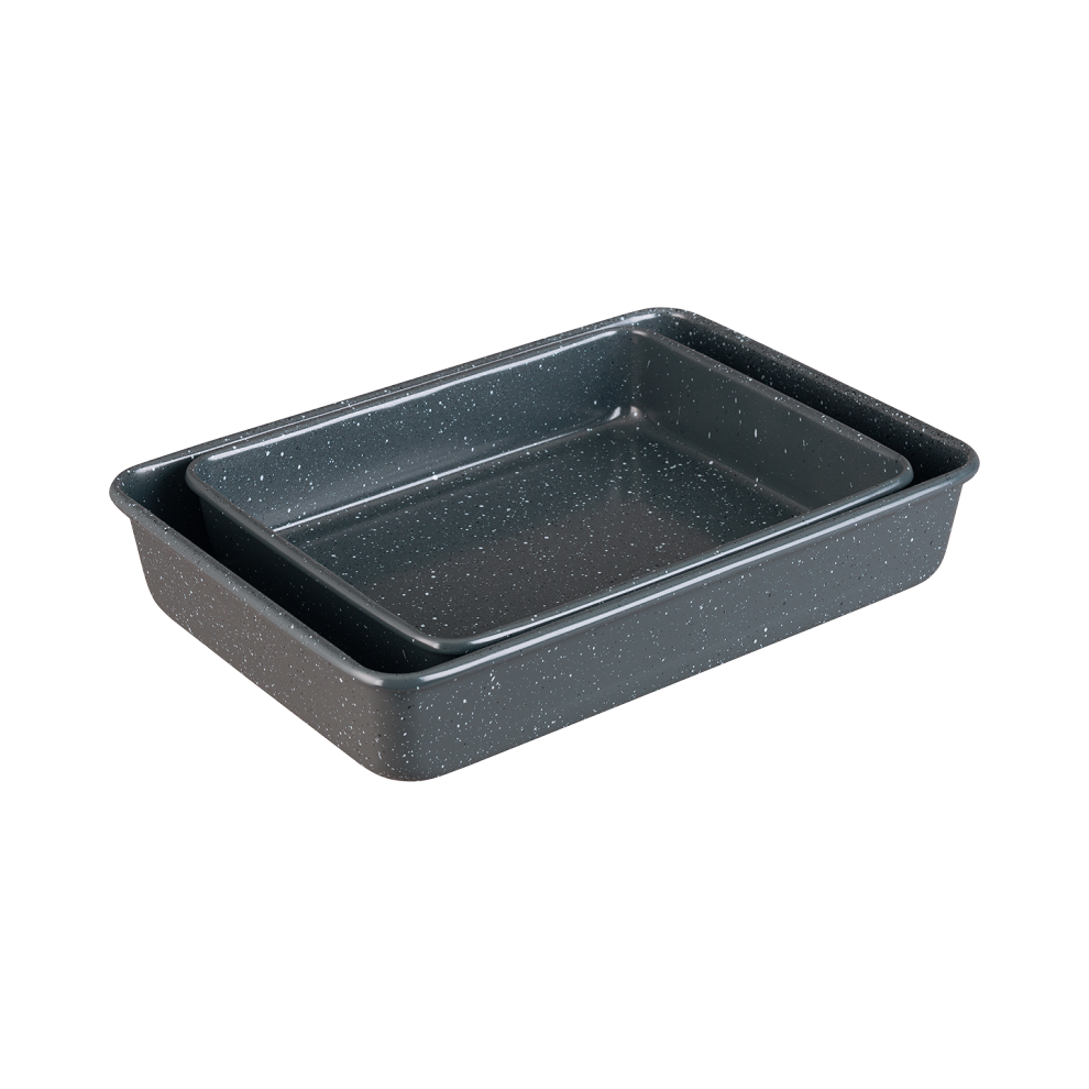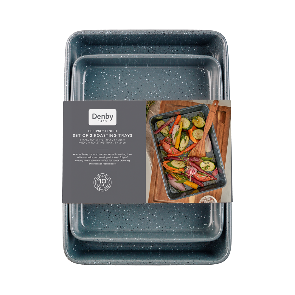 A set of heavy duty carbon steel versatile roasting trays with a superior hard wearing reinforced Eclipse coating with a textured surface for better browning and superior food release.