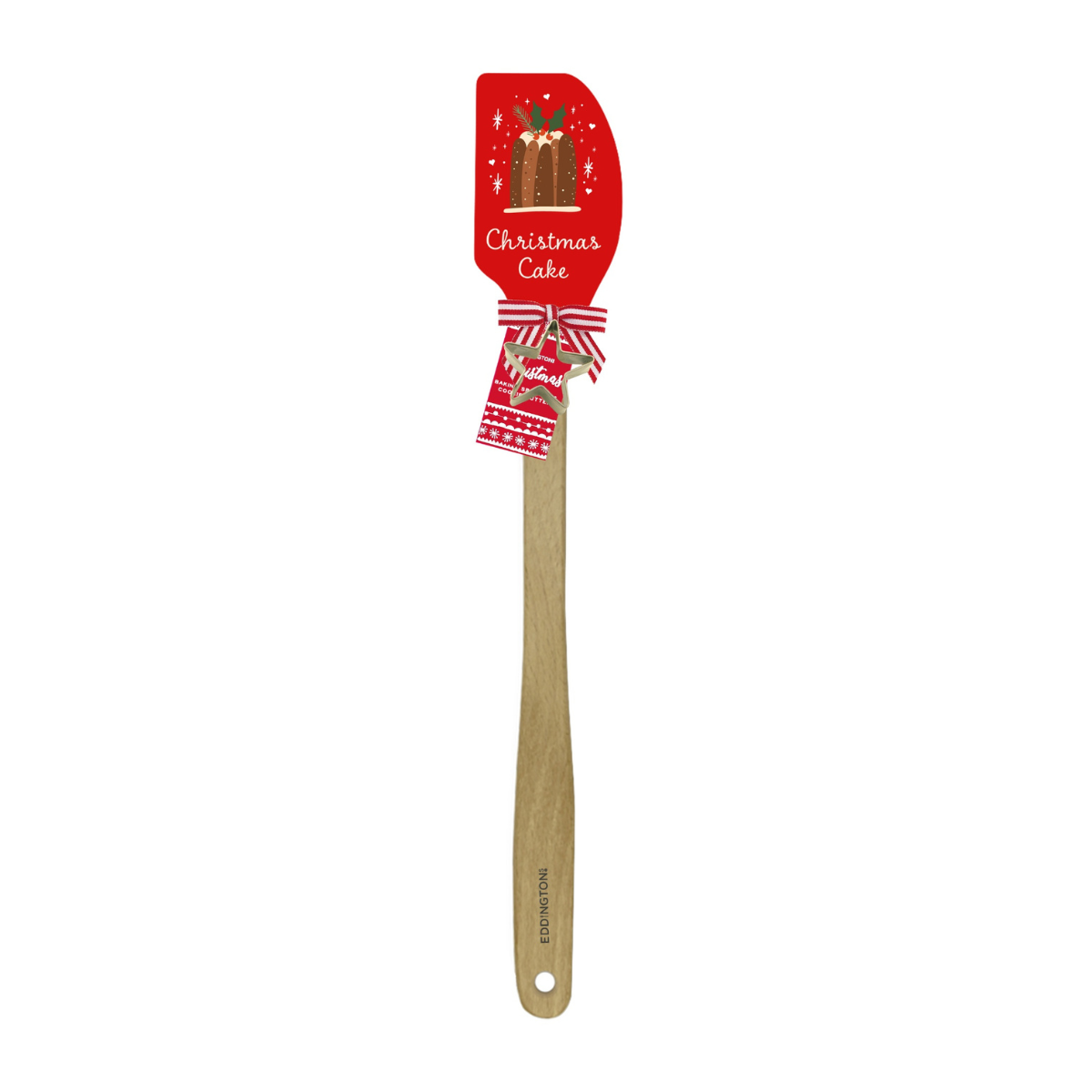 Scruptious baking spatula with a festive cake illustration and a copper star cookie cutter attached to the neck with a ribbon and gift tag.