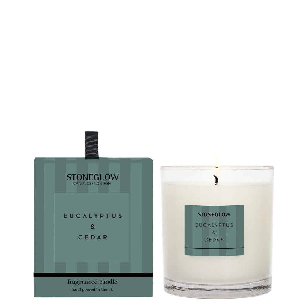 EUCALYPTUS & CEDAR - Cool eucalyptus blended with soft peach and fresh bergamot, on a bed of blush roses and aromatic lavender, brought together on a base of warm, woody cedar, the perfect scent for cosy jumpers and frosty nights.