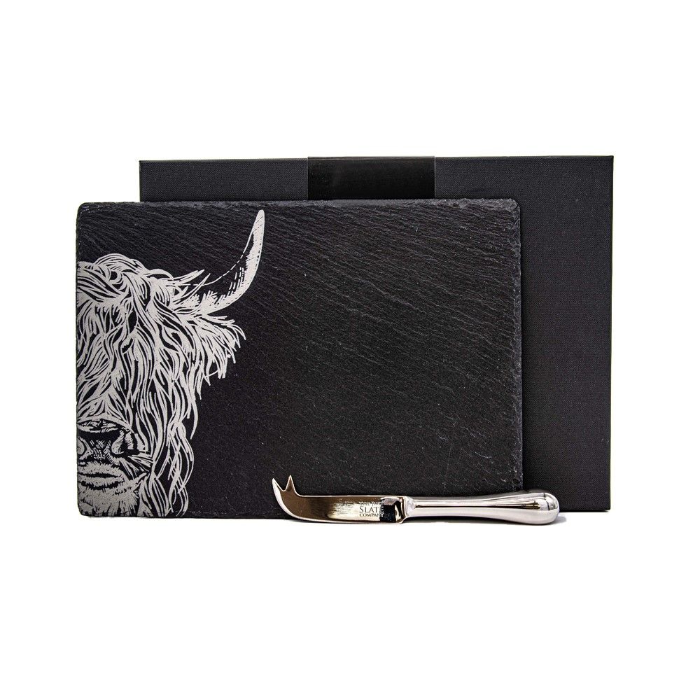 Present and serve your favourite cheeses with our stylish highland cow engraved slate cheese board and knife set. Hand cut in Scotland from high quality slate, our cheese board is not only extremely durable but has a versatile functionality and a natural contemporary elegance too. Engraved with a hand-illustrated drawing of a shaggy highland cow and complete with our stainless steel cheese knife - this set is a truly unique gift for any cheese fan. Complete with a high quality gift box this set is an ideal engagement, wedding, housewarming or birthday gift. Dimensions: Slate 35cm x 25cm knife 22cm x 3cm Material: slate and stainless steel Product care: Stainless steel - dishwasher safe. Slate - Wipe clean. Olive oil can be applied to slate to revive deep black colouring over time Gift Boxed Cheese Board and Cheese Knife Slate hand crafted in Scotland Food safe Foam backing