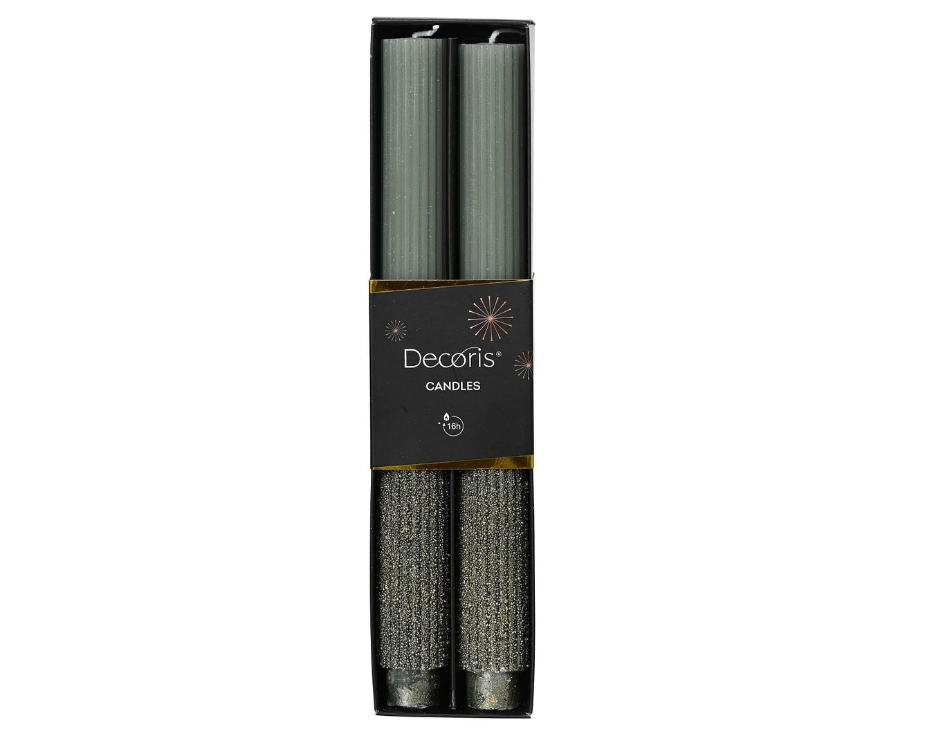 Decoris Dinner Candle Rosemary Green Looking to elevate your Christmas dinner ambiance with a touch of elegance? This Decoris dinner candle in a soothing rosemary green is perfect for adding warmth and charm to your indoor setting. - Crafted from high-quality paraffin - Stands tall at 26.5 cm with a 2.8 cm diameter - Delightful granule and glitter decoration for added sparkle - Handmade with precision for a unique touch - Offers an impressive burning time of 16 hours This beautiful candle is designed for indoor use, and its vibrant green shade effortlessly complements the festive spirit. Perfect as a centrepiece for your dining table or to create a cozy atmosphere in your living space, the rosemary green shade of this candle adds an enchanting glow. Whether you're hosting a Christmas feast or enjoying a quiet evening at home, this delightful candle ensures a warm and inviting environment. Light up your holiday celebrations with the delightful charm of the Decoris Dinner Candle!dia2.8cm x H.26.5cm