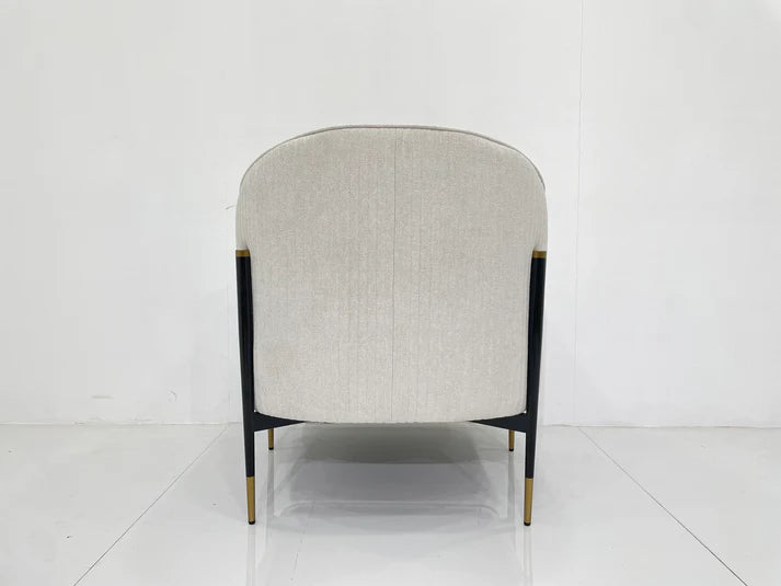 It features a textured linen finish that adds a sophisticated touch and a soft, inviting feel. The chair is accented with gold detailing, which highlights its refined aesthetic. The fine legs combine black and gold elements, offering a sleek and elegant foundation.