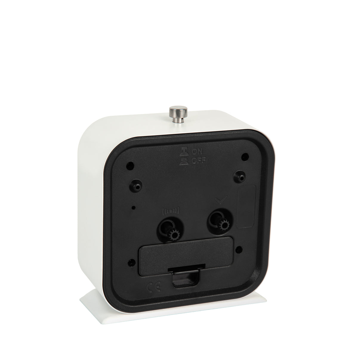 A uniquely styled retro alarm clock packs personality. The muted matt-finished metal stand and frame highlight the delicate profile around the classic dial. A gentle shade of warm snowberry white uplifts the masculine styling.