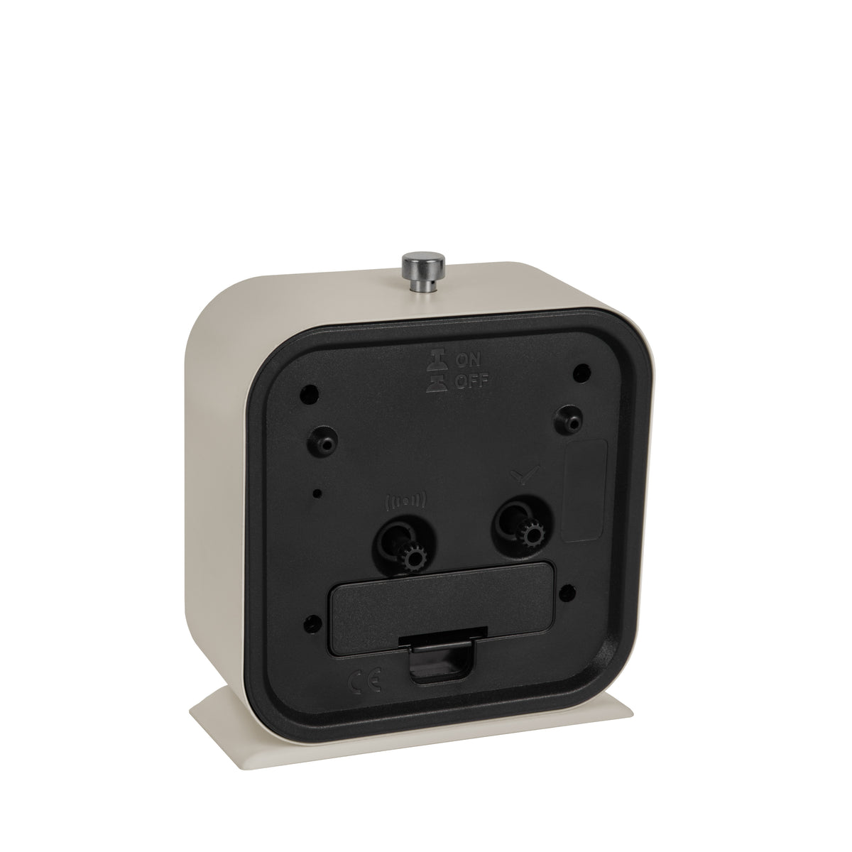 A gentle shade of warm taupe uplifts the masculine styling. A neat chrome alarm hand and 'off' button complete the design. The Finch holds a silent movement.