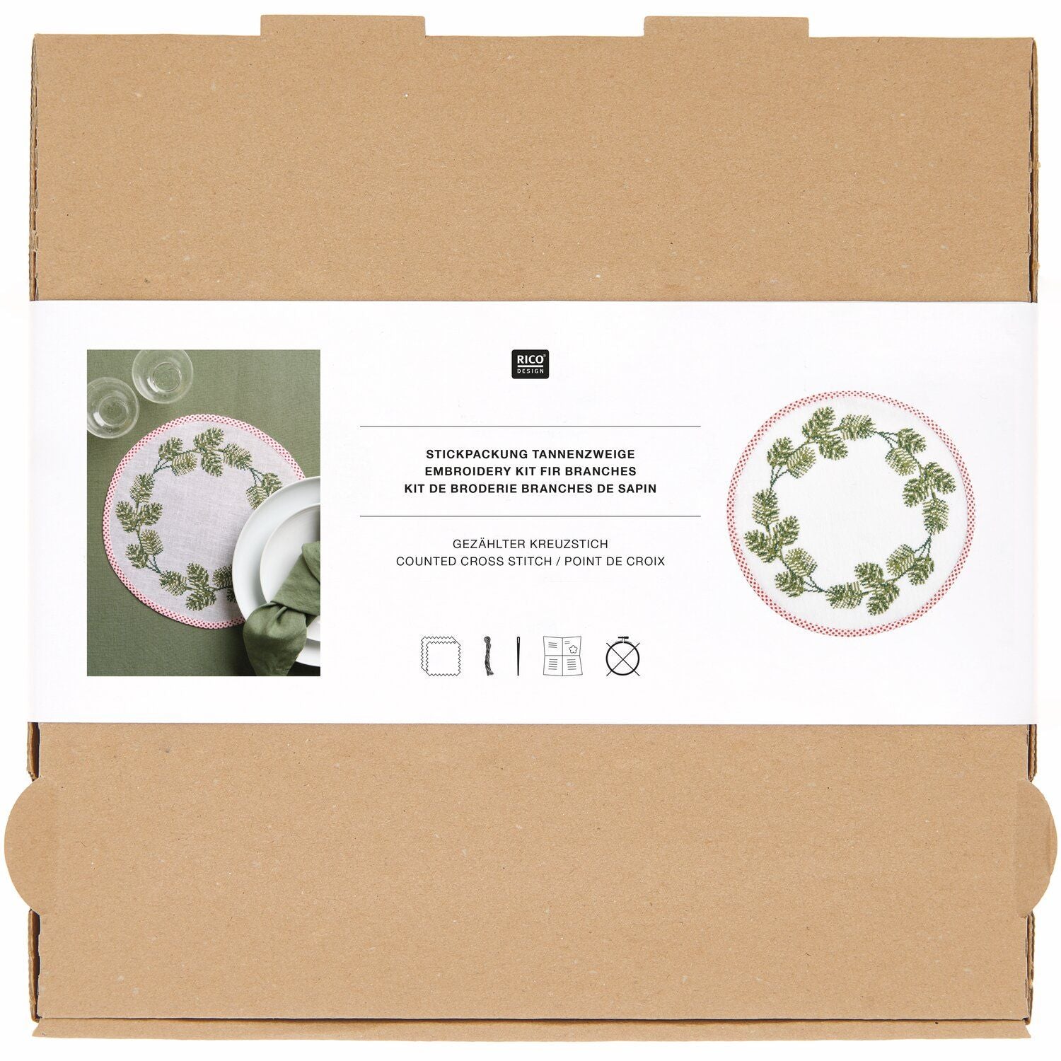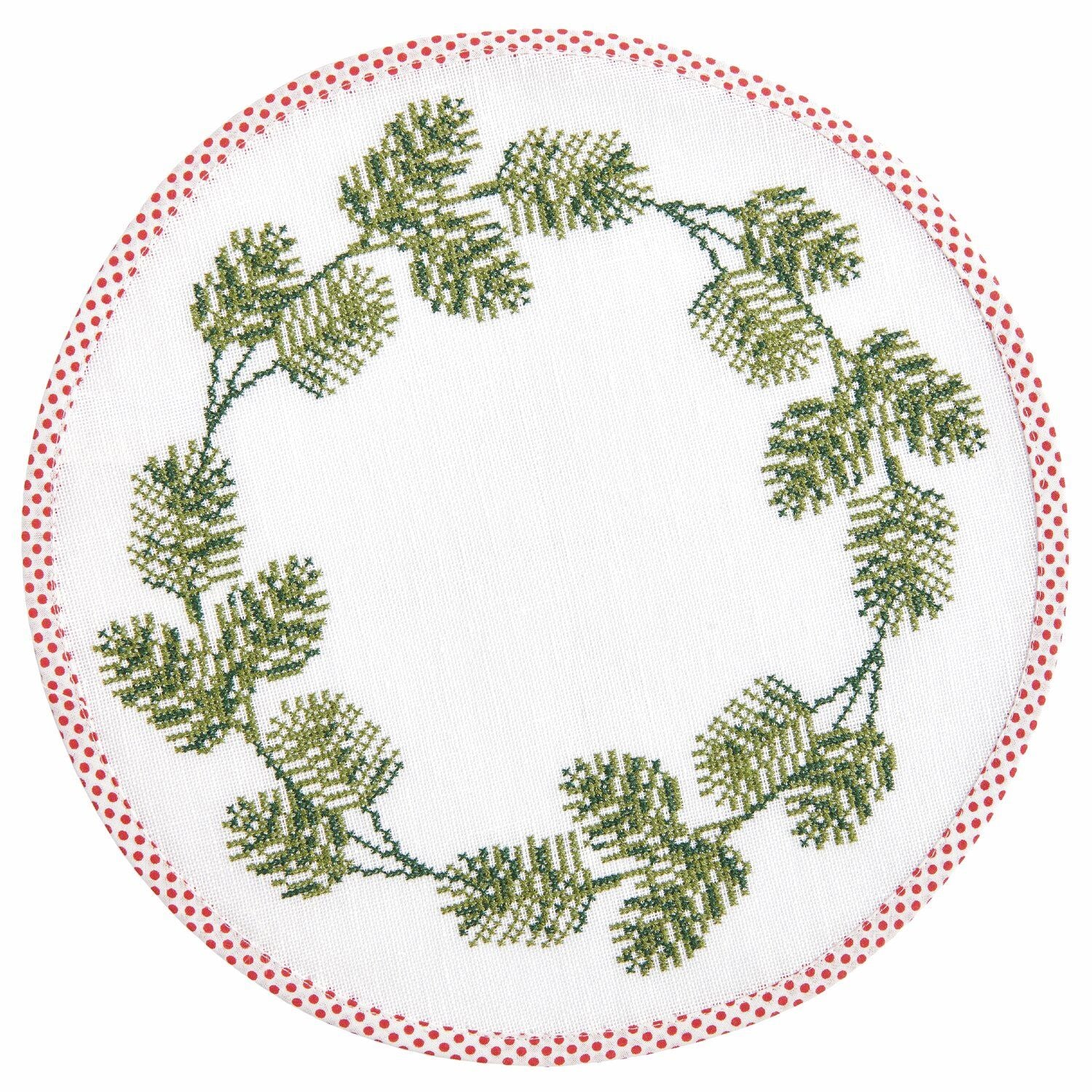 The round placemat embroidery kit Pine Branches in counted cross stitch adds winter charm to your table decoration. It contains two placemats with a diameter of 30 cm, embroidered with delicate pine branches. The detailed motif creates a festive atmosphere and combines traditional craftsmanship with creative design.