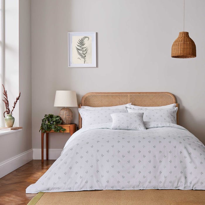 Thalia presents a simple all-over sprig-style print in a soothing Mourne green colourway. Finish the look with the coordinating cushion, finished with an embroidered edge on all four sides. Beautifully soft in 180 Thread Count, Cotton Percale. Single Duvet Includes 1 Single Pillowcase Double, King and Superking Size Duvet Includes Pair of Pillowcases