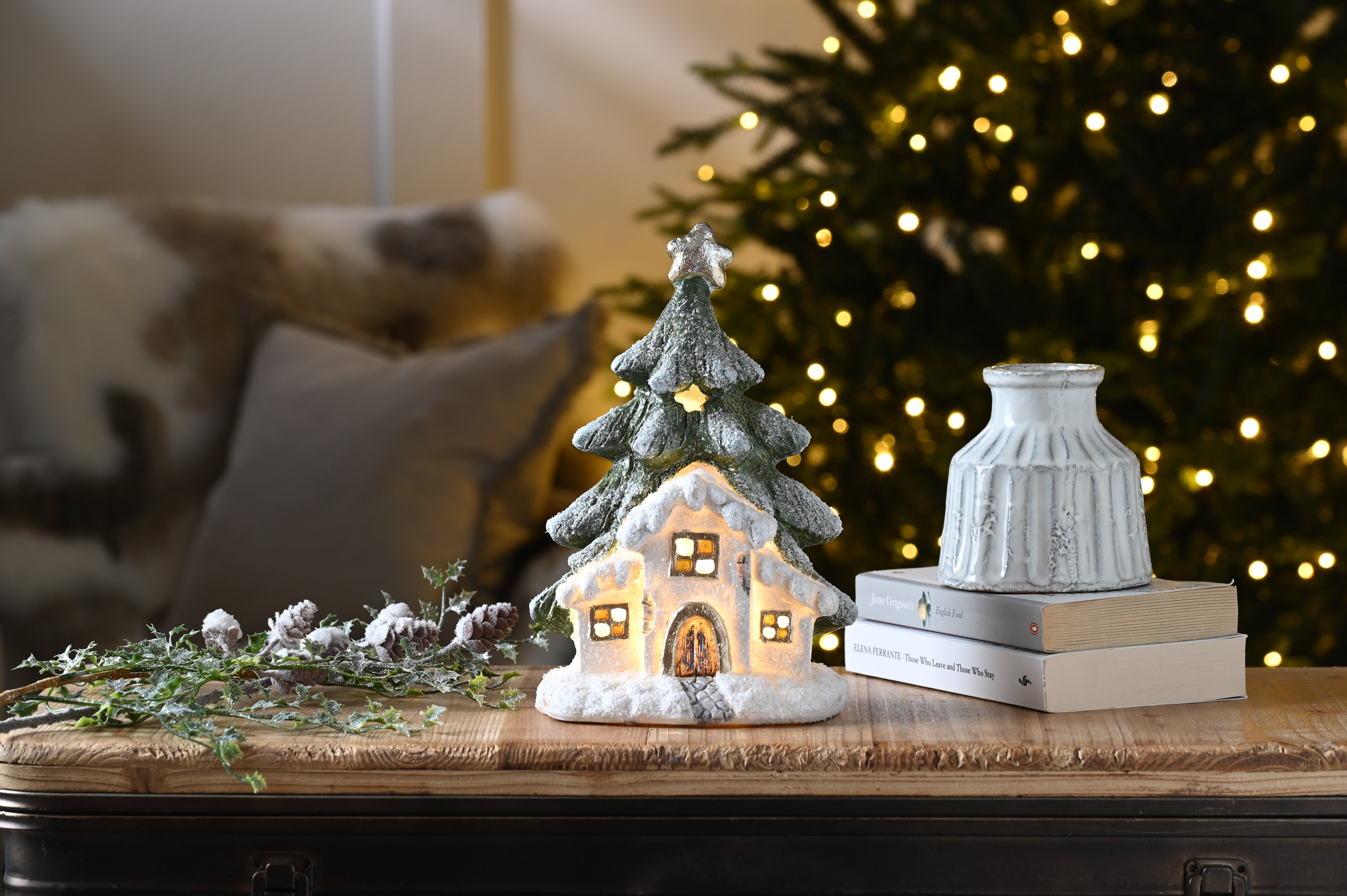 27cm battery operated lit polyresin white frosted house in front of green frosted tree table top decoration - requires 3aaa batteries (not included