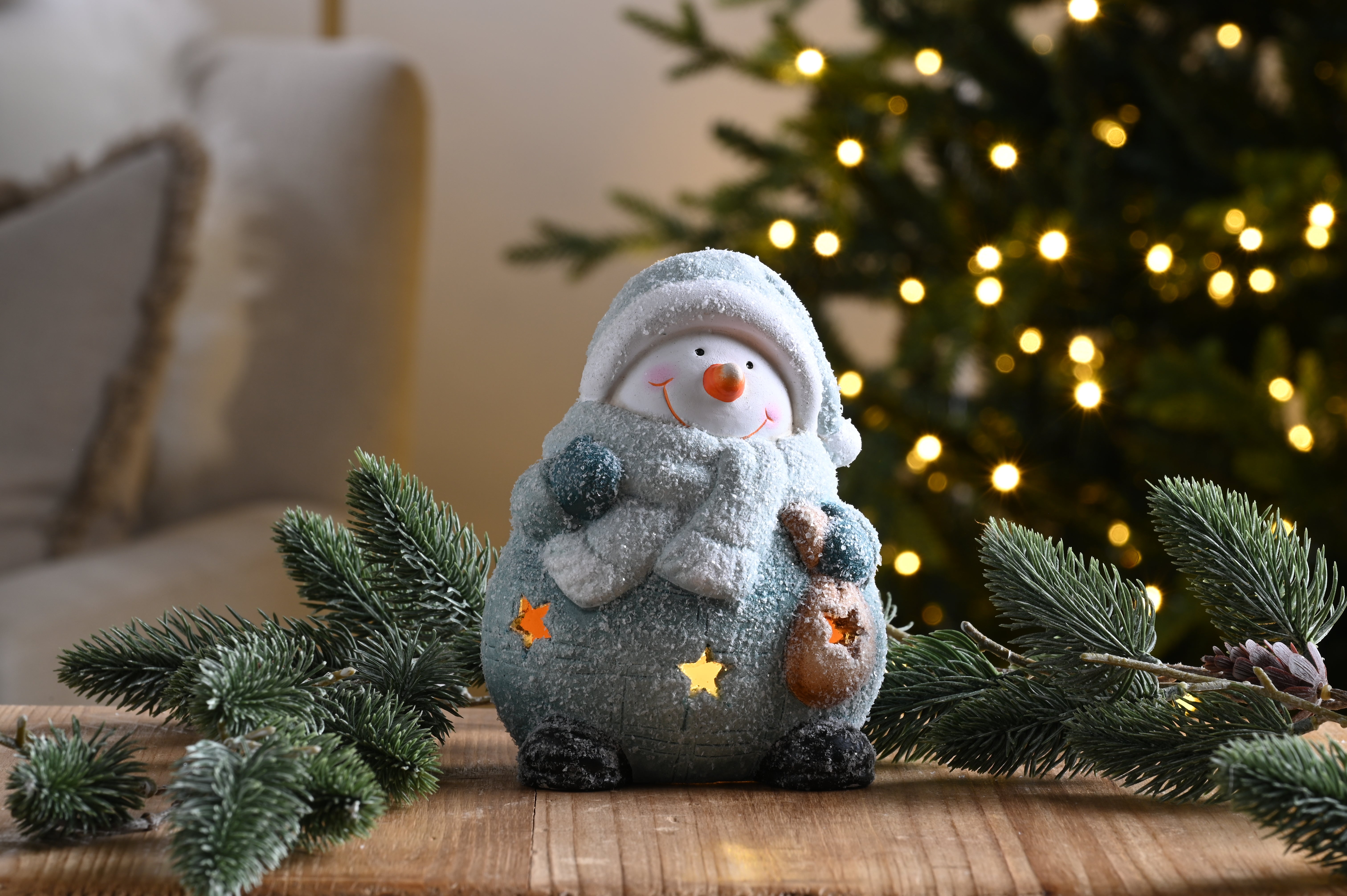 13cm battery operated lit ceramic frosted snowman wearing blue hat and scarf holding sack table top decoration - requires 2 lr44 batteries