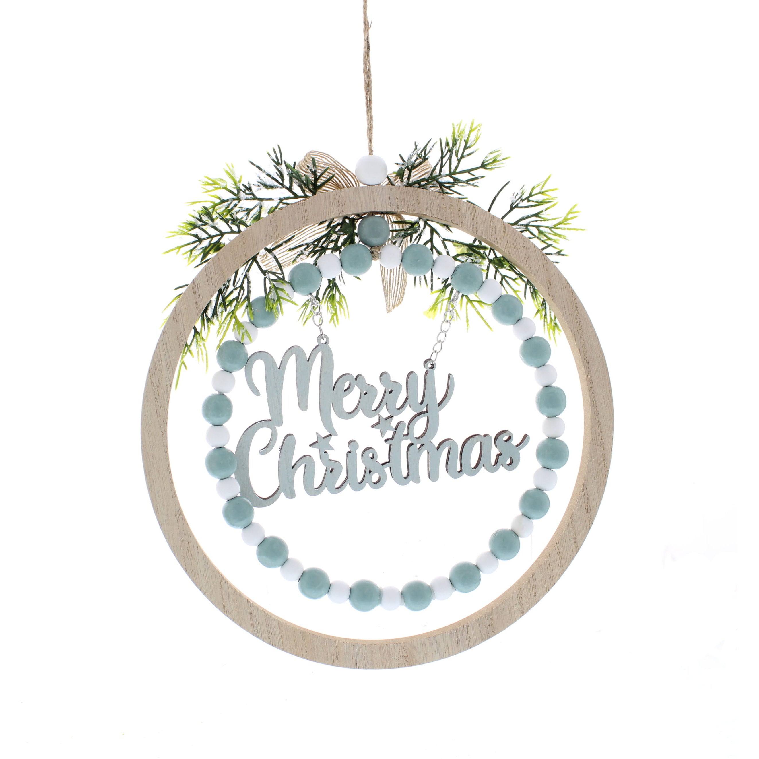 25cm natural wooden disc with blue MERRY CHRISTMAS and foliage hanging decoration