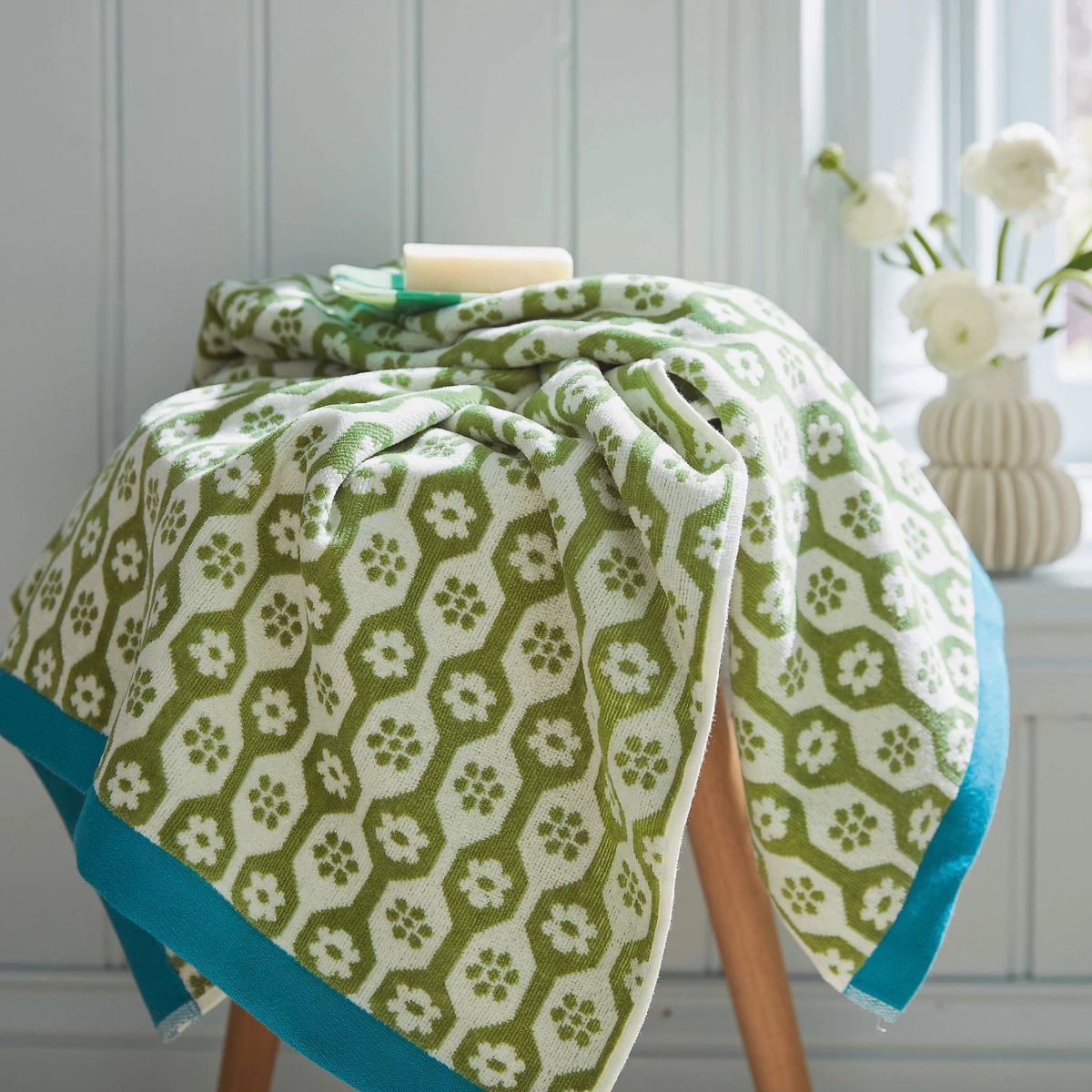 Daisy Towels Green A daisy patterned geometric design jacquard towel in green with a contrasting teal hem to the top and bottom.