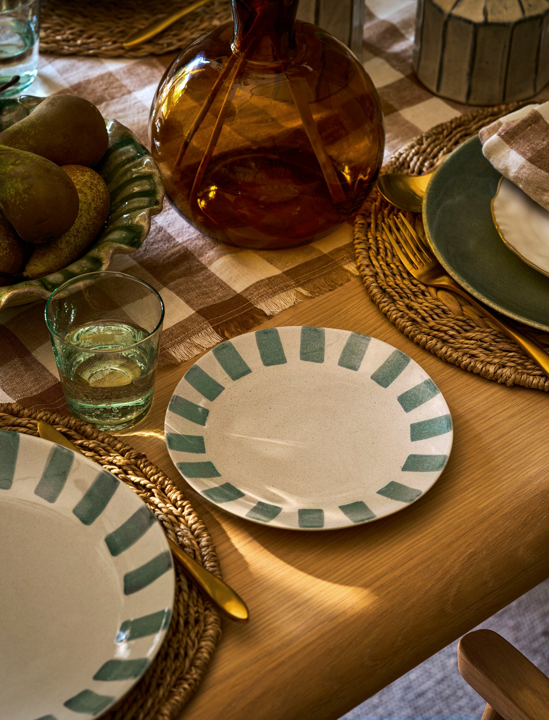Mealtimes are more stylish with our Cranwell Stripe Edge Side Plate. The fern green stripe on this beautiful stoneware plate is painted by hand, so each one is unique. This side plate is perfect for serving up scrambled eggs on toast for breakfast, sandwiches for lunch and starters at a dinner party. Team it with other crockery from our Cranwell Stripe Edge collection for a unified look, or mix it up by pairing it with our Winderton Rosemary dinnerware.