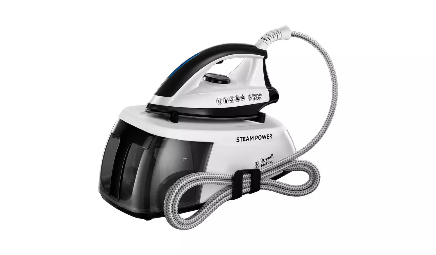 Introducing the Russell Hobbs Steam Power Series 1 Steam Generator Iron, which powers through tough wrinkles with ease. With a generous 4.5 bar pressure, it gives ultimate steam performance. Ideal for crease removal, the large 90g of pressurised steam glides through stubborn creases easily, and with its 1.3. Litre water tank you can iron for longer without having to refill. With an impressive 60 second heat up time, and stainless steel non-stick coating, blitzing your way through your ironing should be a breeze.